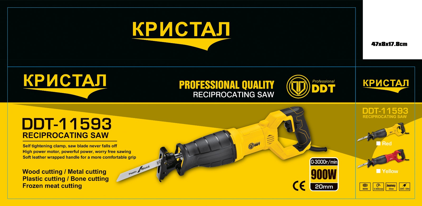 Fierăstrăul electric tip sabie KRISTAL DDT-11593 este o unealtă puternică și versatilă, concepută pentru tăierea rapidă și eficientă a diferitelor materiale. Dotat cu un motor de 900W, acesta asigură o performanță ridicată și o tăiere fără efort.
